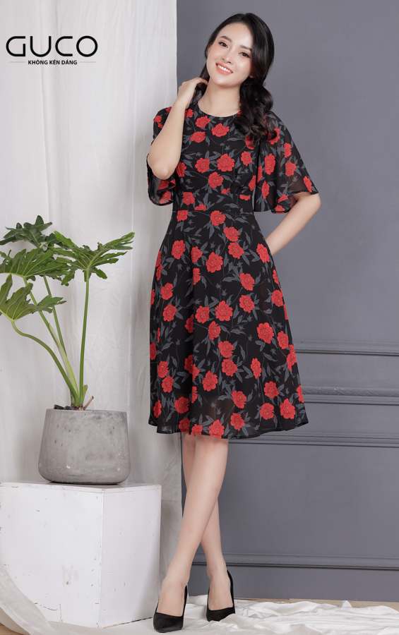Với kiểu dáng đơn giản, kín đáo kết hợp màu đen in họa tiết hoa màu đỏ, đầm xoè in hoa sẽ là item được các quý cô tìm kiếm. Với thiết kế tay cánh tiên, dáng váy xòe rộng giúp bạn xinh đẹp như một nàng công chúa giữa phố đông người.