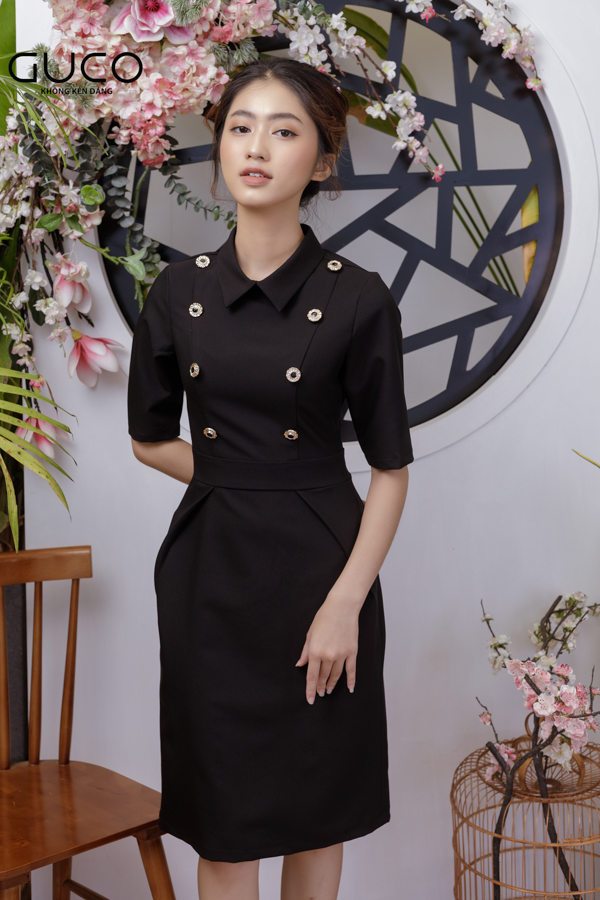 Với chất liệu vải Cotton lạnh, không nhăn và thấm hút mồ hôi tốt, GUCO đã cho ra mắt một thiết kế cho nàng công sở. Đồng thời thấu hiểu được yêu cầu chốn công sở nên chúng tôi đã thiết kế phần cổ sơ mi lịch sự, tay lỡ phù hợp cho nàng đến công sở hay diện đi tiệc, gặp gỡ đối tác, khách hàng nhưng vẫn không kém phần sang trọng. Cùng với tông màu đen đậm kết hợp cùng hai hàng nút ánh kim tạo nên điểm nhấn ấn tượng cho chiếc đầm.